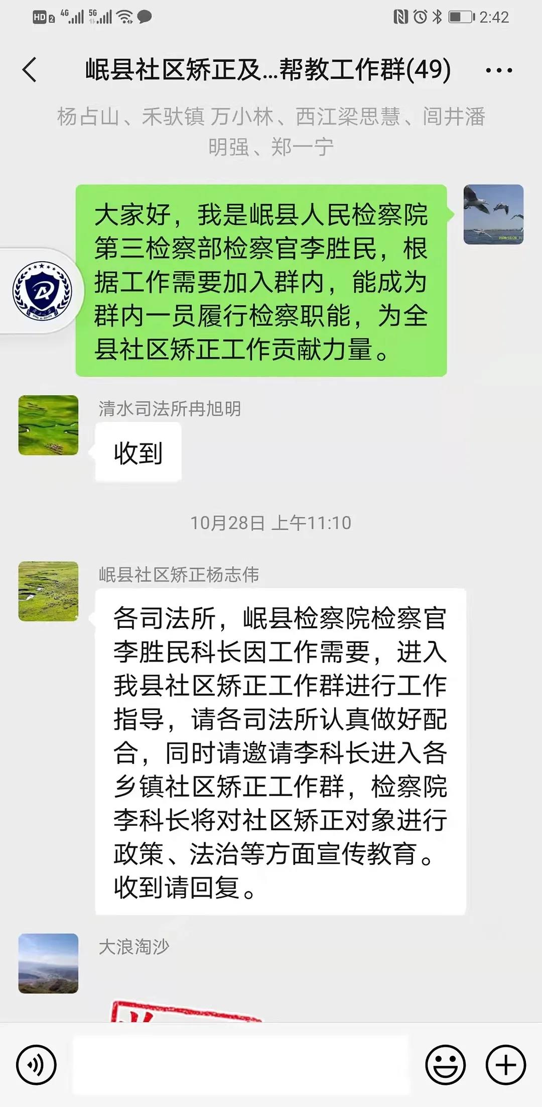 近日,我院与县司法局积极协调沟通,刑事执行检察部门检察官李胜民被邀请加入岷县司法局社区矫正工作群和各乡镇司法所社区矫正工作群,实现对社区矫正对象网上监督全覆盖。
